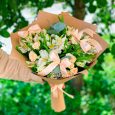 Букет светло-розовых роз и клубники