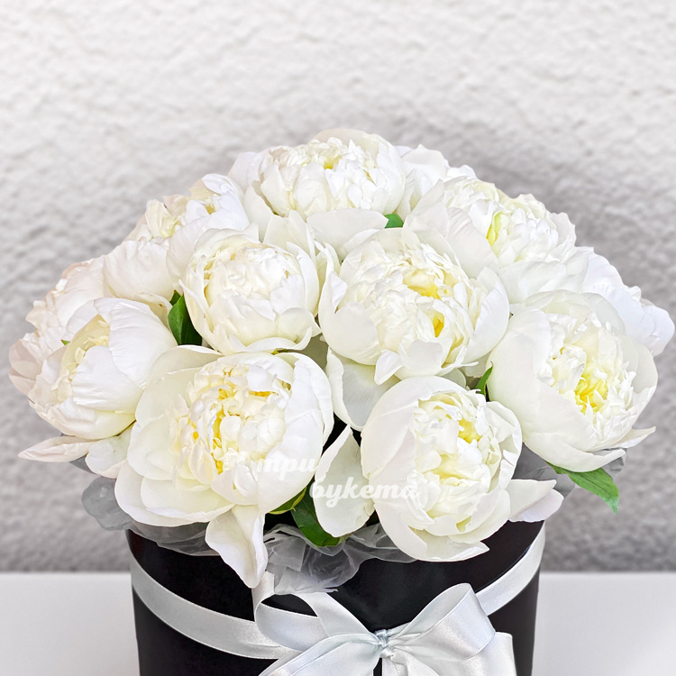 17 белых пионов в шляпной коробке
