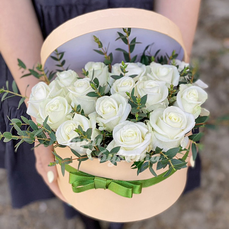 Белые розы с эвкалиптом в коробке