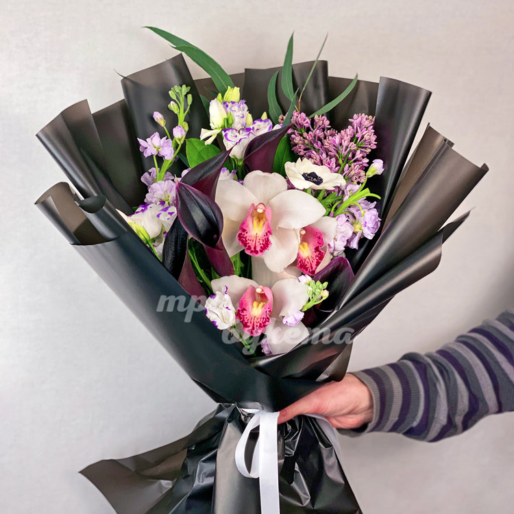 Букет фиолетовых калл с орхидеями