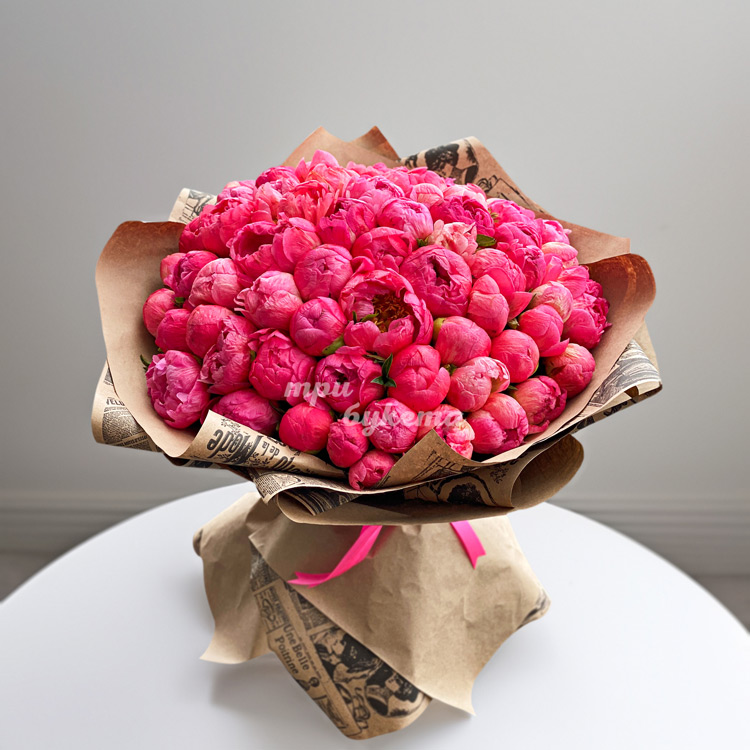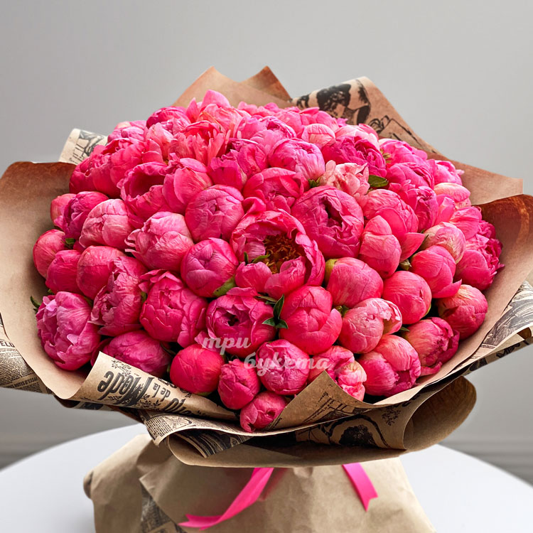 Букет из 55 коралловых пионов в крафте