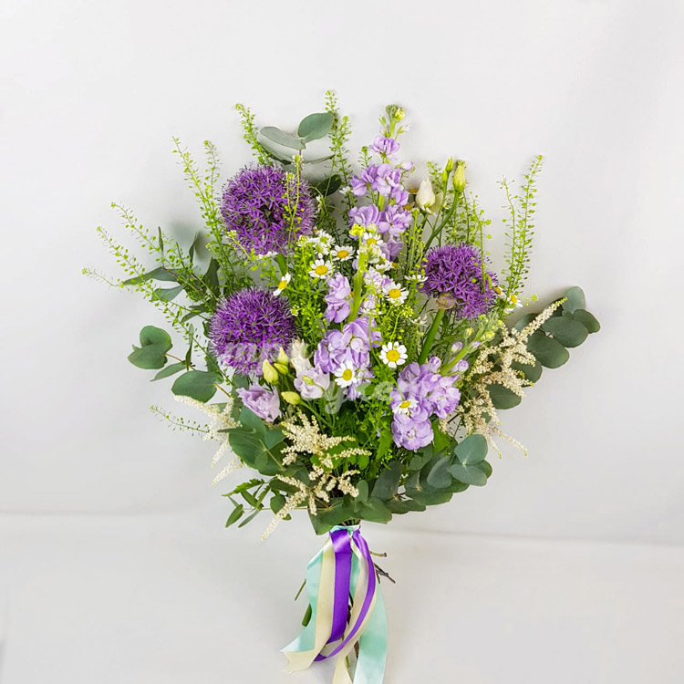Букет из маттиол, ромашки и аллиума