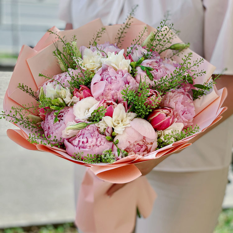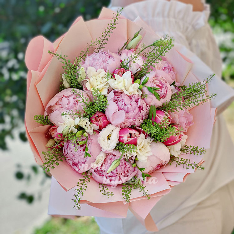 Букет из пионов, фрезий и тюльпанов