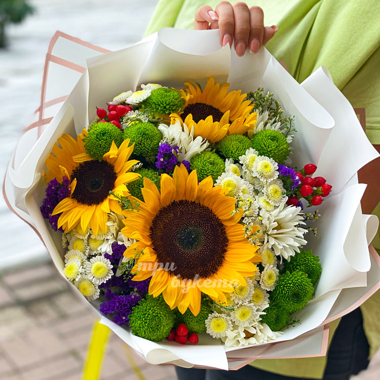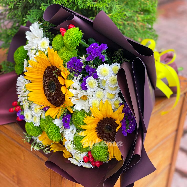 Букет из подсолнухов и хризантем