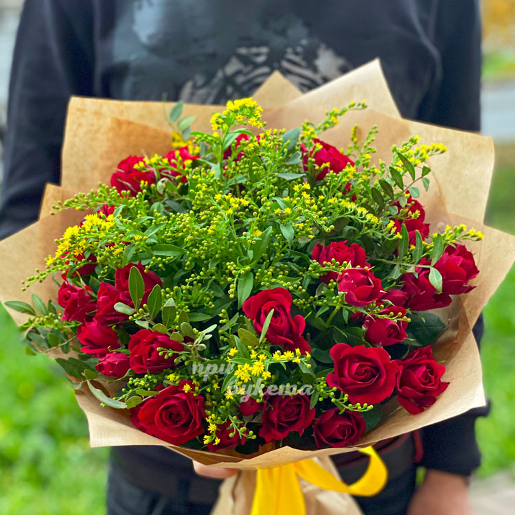 Букет красных кустовых роз с зеленью
