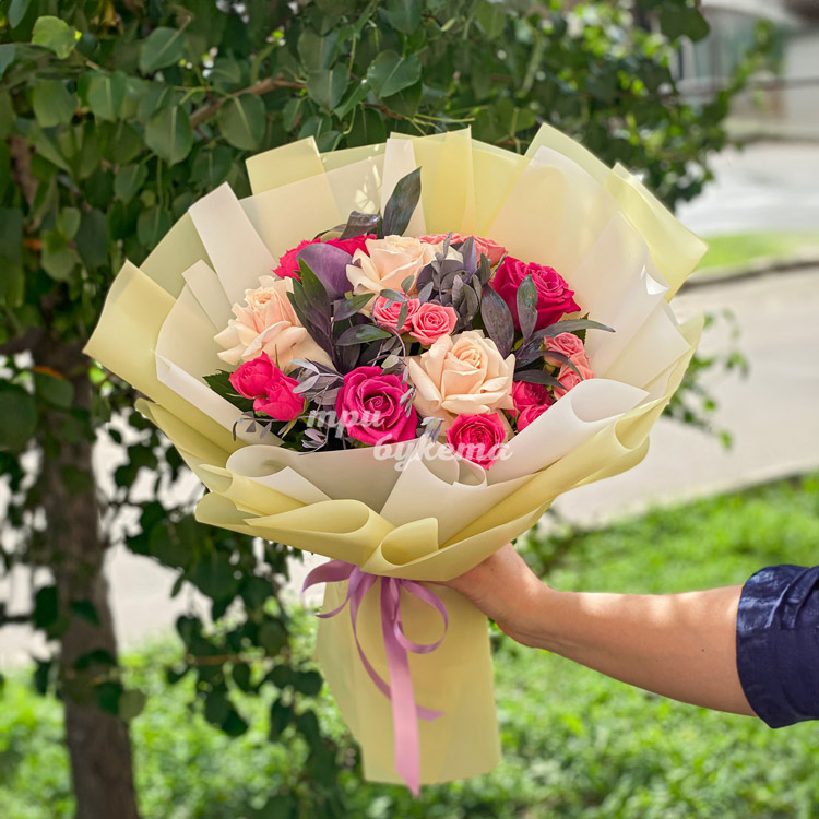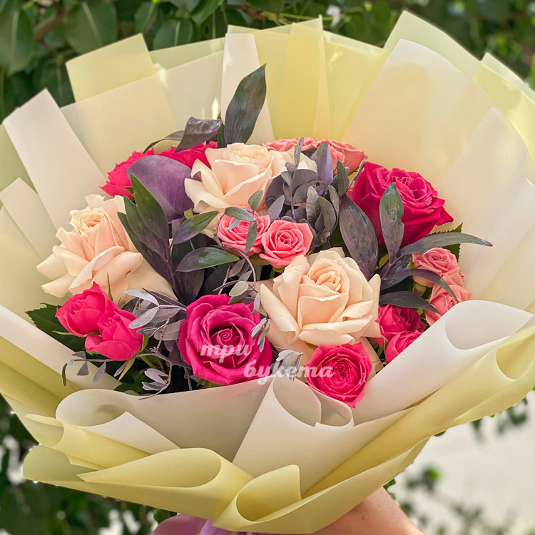 Букет розовых и кремовых роз с зеленью