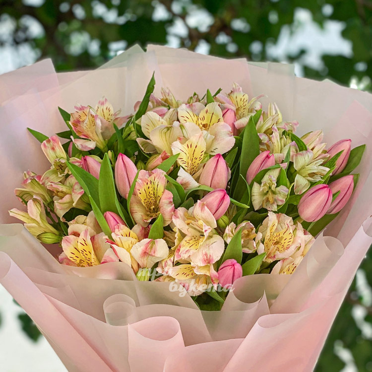 Букет розовых тюльпанов и альстромерий