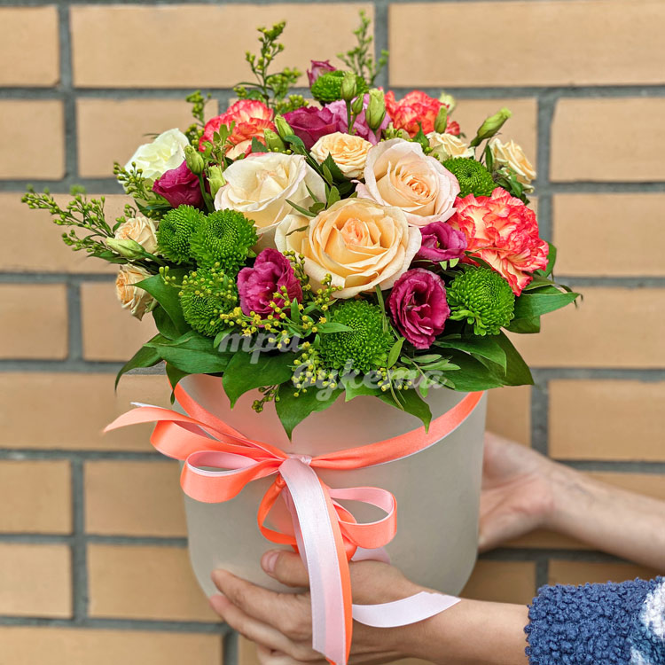 Коробка персиковых роз и зеленых хризантем