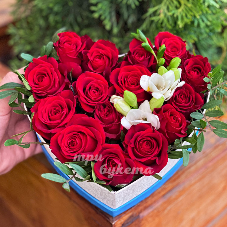 Коробка-сердце красных роз с фрезиями