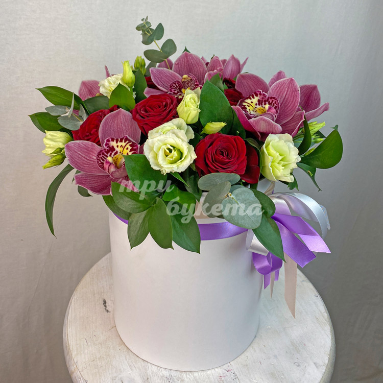 Коробка темно-розовых орхидей и красных роз