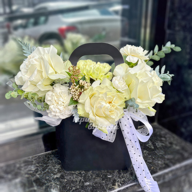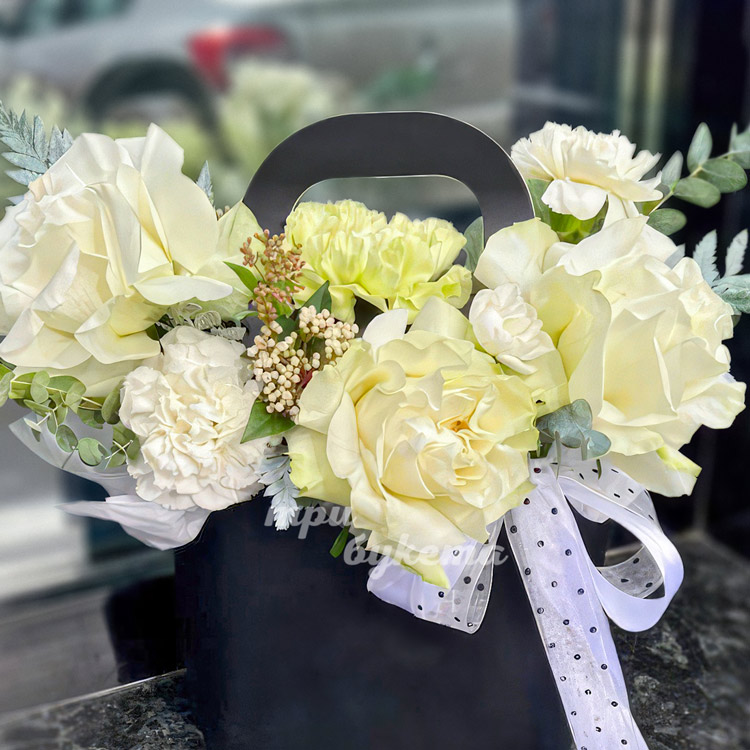Коробочка белых диантусов и французских роз