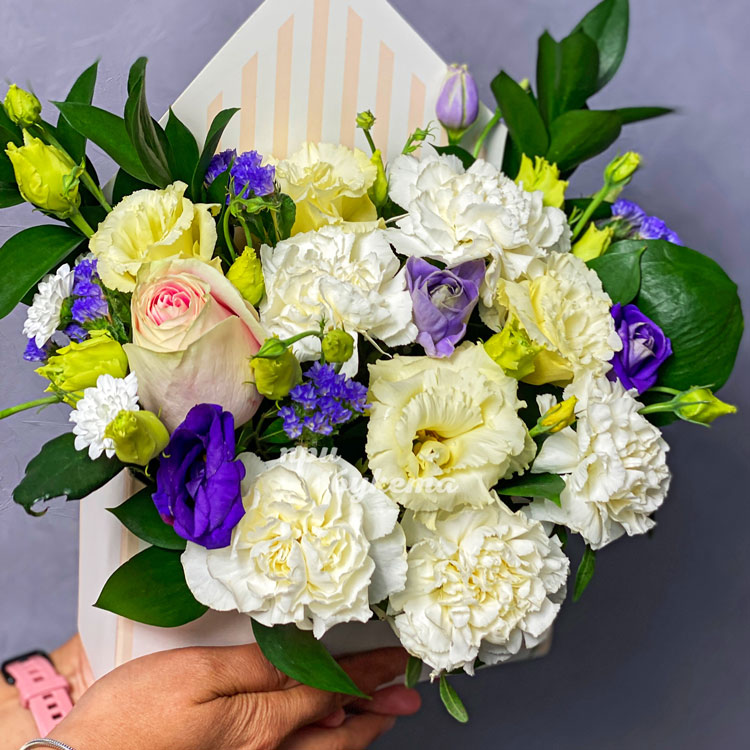 Коробочка белых гвоздик и эустом