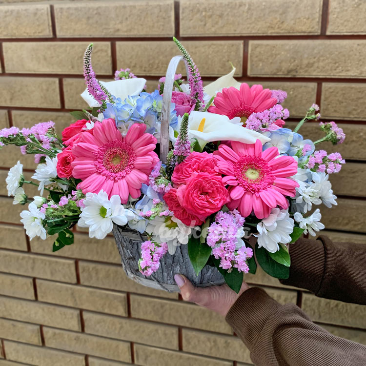 Корзина розовых гербер и лимониума