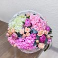 Корзина ярких роз с гипсофилой и лимониумом