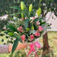 Красный букет из хризантем, орхидей и роз