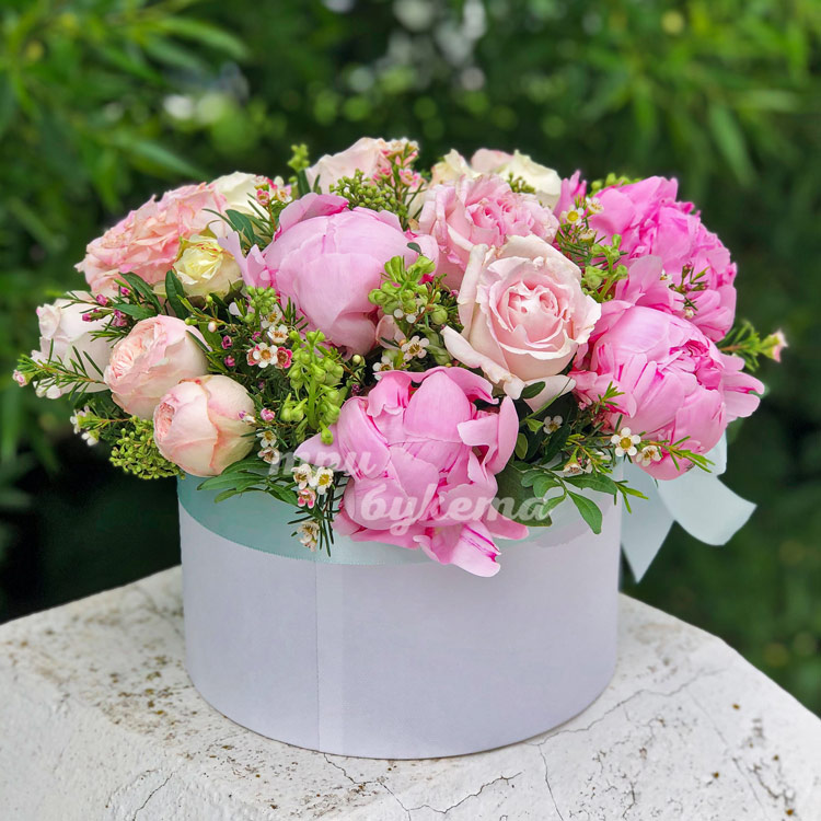Нежные пионы в шляпной коробке