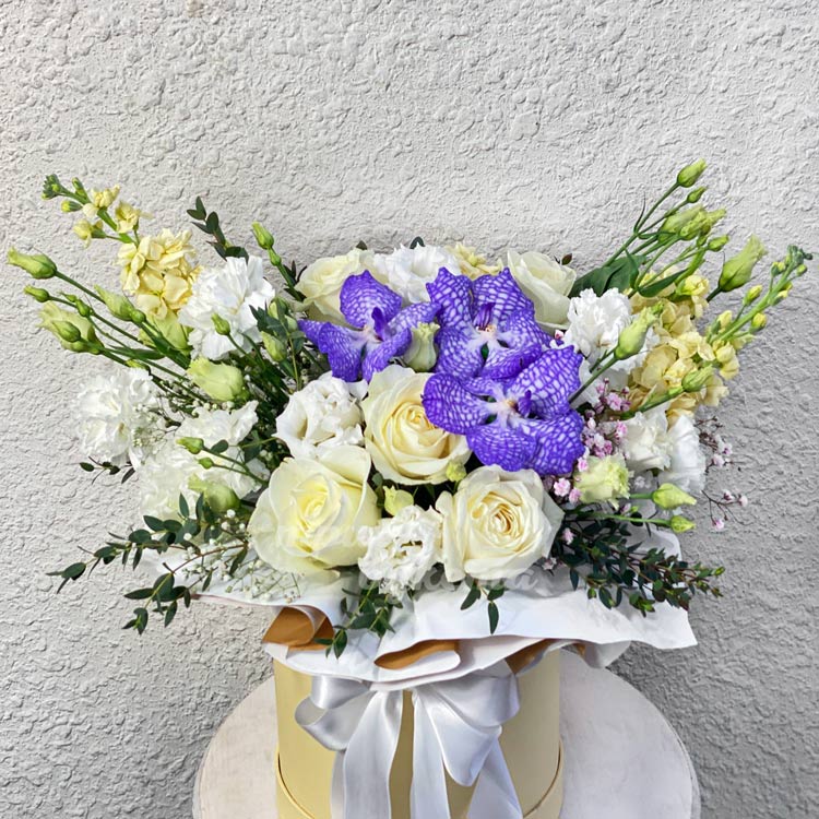 Розы и орхидеи в шляпной коробке