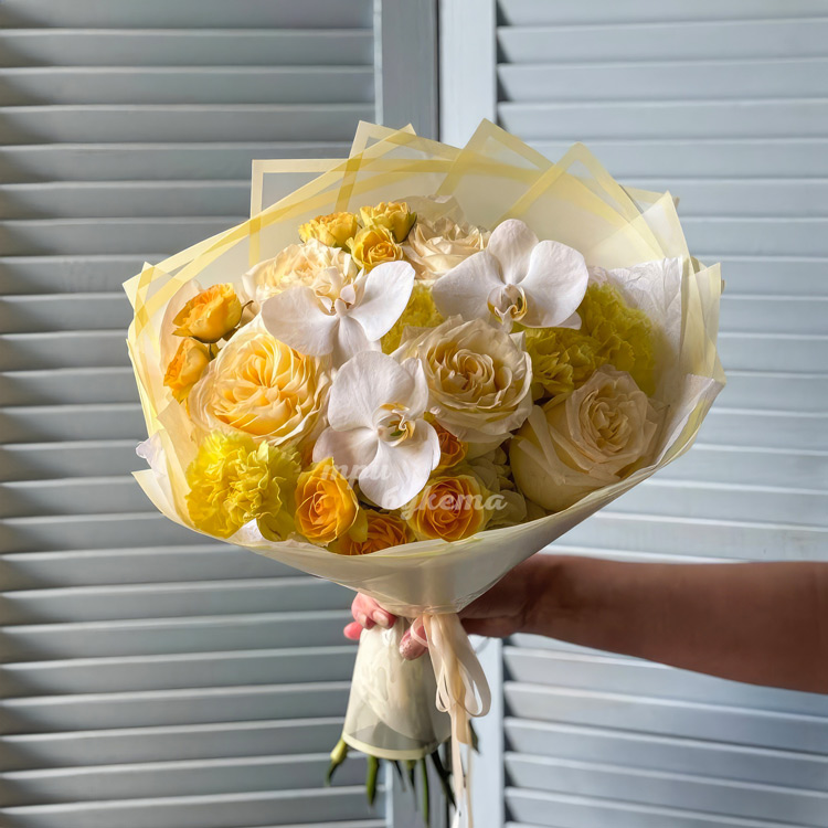 Ярко-желтый букет роз, гвоздик и орхидей